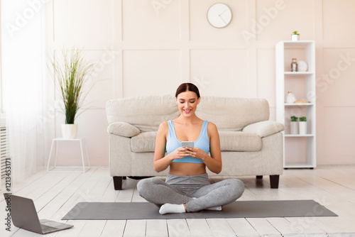 woman, yoga, home, online, caucasian, training, phone, activity, domestic, smartphone, loss, concept, young, gym, girl, fit, video, smile, indoor, body, meditation, sitting, technology, app, background, lady, white, mobile, adult, fitness, application, lifestyle, well-being, healthy, sporty, wellness, leisure, relaxation, people, lotus, weight, mobile phone, female, health care, physical exercise, computer, laptop, cyberspace