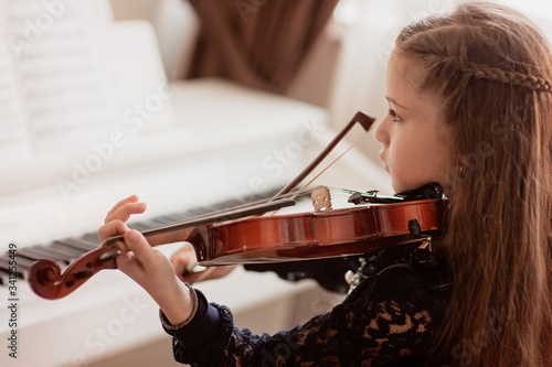 Home lesson for a girl playing the violin. The idea of activities for children during quarantine. Music concept