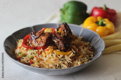 Home made mixed vegetable fried rice served with dry chicken fry.