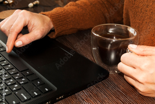 Home Office. A woman sits at a laptop and holds a cup of coffee. Glass cup in the shape of a heart and double glass in a female hand. Work at home.