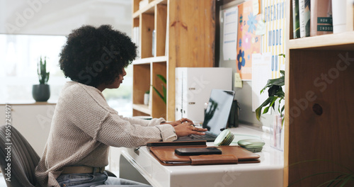 Home office, laptop and woman entrepreneur typing online for creative job, blog post or editing. Freelance work, technology and African person with connection for proofreading, writing or search