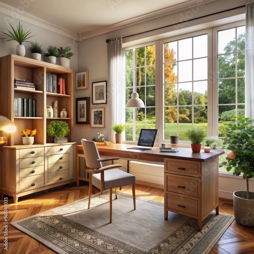 Home Office with Wooden Desk and a View, office decor, home design, work space