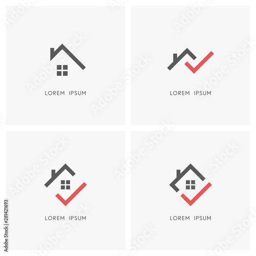 Home outline logo set. House roof with chimney and window and red check mark or tick symbol - real estate, realty and property icons.