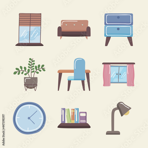 home, space, clock, lamp, window, table, couch, chair, book, plant, furniture, interior, living, room, house, apartment, comfortable, style, object, luxury, contemporary, decor, vector, design, illustration, icon, set