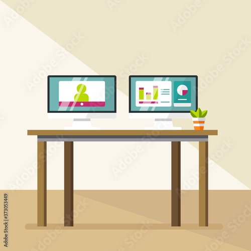 Home workspace illustration. Video call, graphic designer, finance, monitor, desk, table, computer.