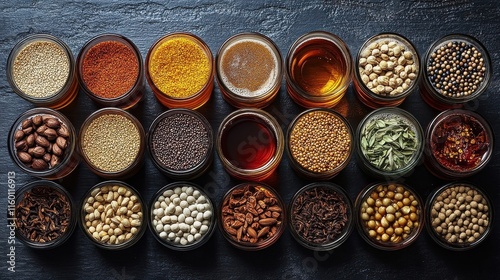 [Homebrew beer ingredients brewpub] Colorful Glass Spice Bottles Displayed Artfully on Wooden Table