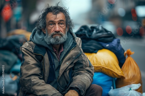 homeless, man, sitting, street, poor, poverty, beggar, social, problem, concept, hopeless, despair, sidewalk