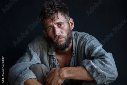 Homeless man with strong expression sitting on floor in dim environment showcasing a deep sense of struggle and despair