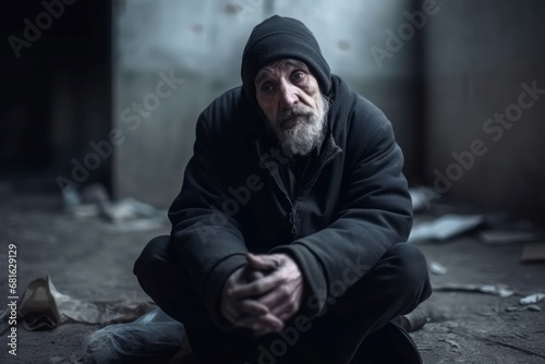 Homeless old beggar man. Poor bearded man begging on the street. Generate ai