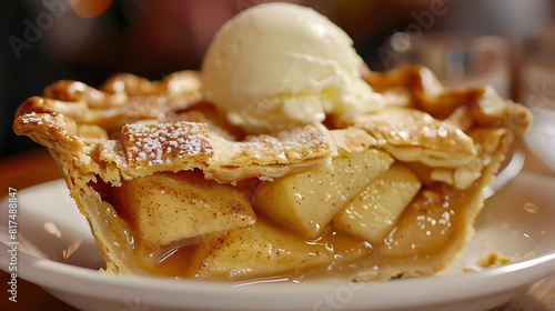 homemade apple pie with flaky crust and cinnamon served on a white plate, accompanied by a scoop of white ice cream