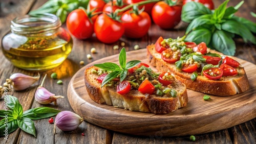Homemade bruschetta with cannabis-infused oil, tomatoes, basil, and garlic