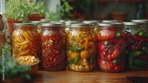 Homemade canned vegetables in glass jars on wood table. Pickled food seasonal harvest with tomatoes cucumbers red bell pepper herbs. Vegetarian organic food preserves for winter season.