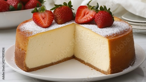 Homemade cheesecake with a smooth texture, garnished with fresh strawberries and a dusting of powdered sugar, minimalistic setting