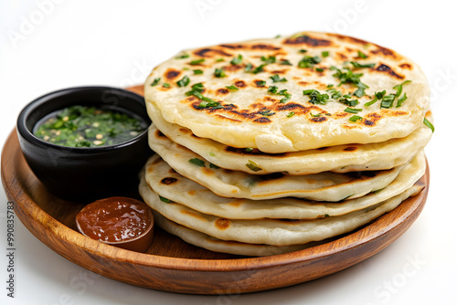 Homemade Chinese green onion pancakes with sauses isolated on white background
