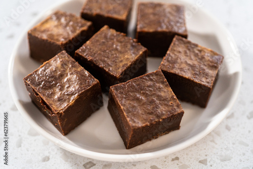 chocolate, cooking, dessert, food, fudge, piece, receipe, sweet food, sweet, white plate, confectionery, making, peanut butter, plate, preparing, soft
