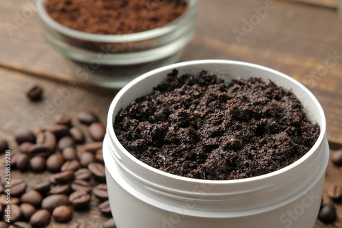 homemade coffee scrub in a white jar for the face and body and various ingredients for making scrub. spa. cosmetics. care cosmetics
