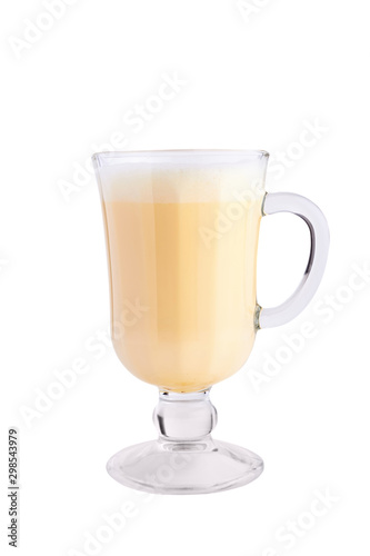 Homemade eggnog with cinnamon isolated on white background. Typical Christmas dessert.
