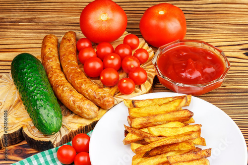 Homemade fast food, portion of french fries, ketchup, grilled sausages and cherry tomato on wooden board.