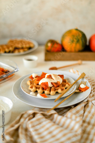 Homemade food - ruddy Belgian pumpkin waffles with a sauce of whipped cream, cottage cheese, honey or maple syrup. Healthy sweets that are not harmful to health. A table with delicious treats.