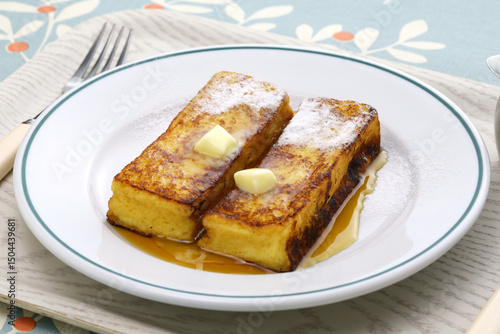 french toast, homemade, bread, sliced, butter, maple syrup, powdered sugar, egg, milk, dessert, sweet, breakfast, lunch, snack, home cooking, knife, fork, background, cut, soaked, french, american, food