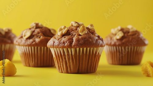 Homemade freshly baked pumpkin muffins with oatmeal and nuts isolated on a yellow background