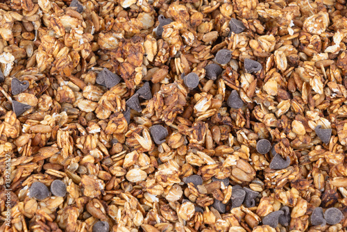 Homemade granola made from rolled oats with various seeds and chocolate chips. Healthy food.