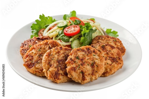 Homemade grilled patties with a fresh crunchy vegetable salad