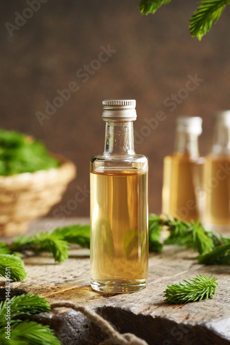 Homemade herbal syrup made with young raw spruce tips collected in spring and brown sugar