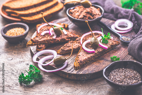 toast, liver, homemade, food, chicken, meal, slice, bread, delicious, sandwich, meat, lunch, closeup, breakfast, pork meat, epicure, duck, background, snack, paste, widener, ingredient, board, baguette, dinner, fresh, nobody, french, traditional, tasty, mousse, knife, goose, herb, poultry, cookery, healthy, creamy, cooking, wooden, basil, pepper, rustic, beef, canape, onion