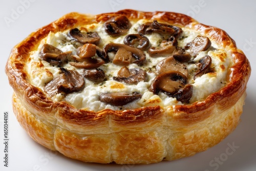 Homemade Mushroom Quiche with Cheese and Creamy Filling on white background