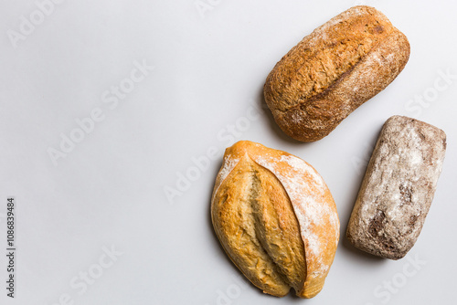 Homemade natural breads. Different kinds of fresh bread as background, top view with copy space