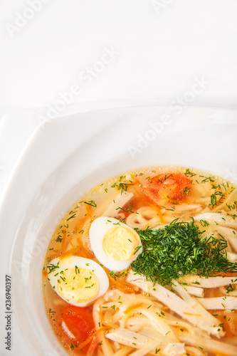 Homemade noodle soup with dill, quail eggs close-up on a white plate