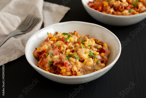 Homemade One-Pot Cheesy Taco Pasta in a Bowl on a black background, side view.