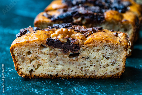 Homemade Organic Healthy Banana Bread Cake Slices with Chocolate Pieces and Walnut.