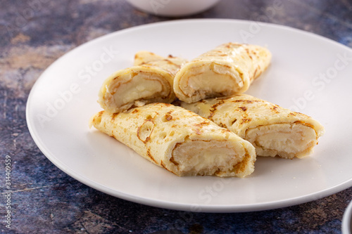 Homemade pancakes with cream cheese and berry jam on a plate, selective focus