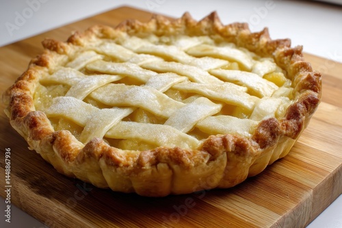 Homemade pineapple pie with pastry dough and filling baked and displayed on a wooden board against a white backdrop