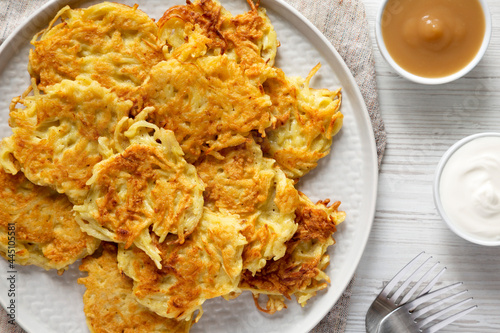 Homemade Potato Pancakes Latkes with Apple Sauce and Sour Cream on a white wooden background, top view. Flat lay, overhead, from above.