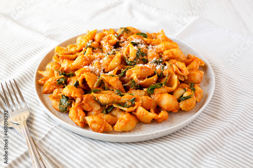 Homemade Pumpkin Pasta with Walnuts and Spinach, side view.