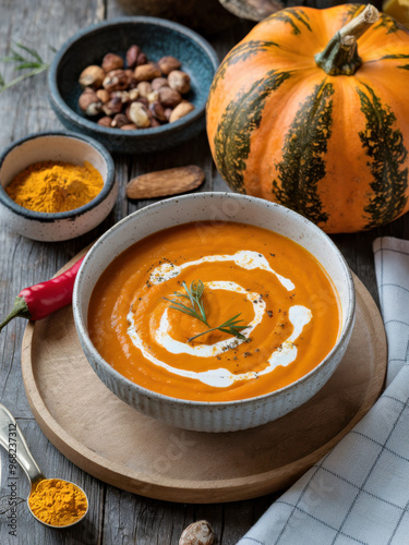 Homemade Pumpkin Soup with Cream Garnish and Seasonal Ingredients in Rustic Setting.
