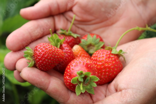 Homemade red and ripe strawberries in the hands of a girl, seasonal berries ripened on my farm