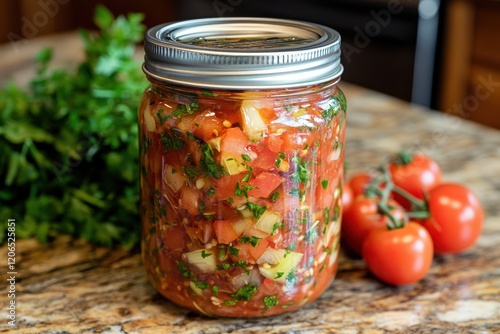Homemade salsa in a mason jar, vibrant red and green. Perfect for adding fresh flavor to any Mexican dish.