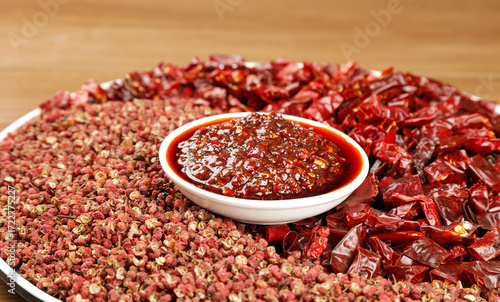 Homemade spicy chili oil with dried red peppers and Sichuan peppercorns for Asian cooking and hot sauce recipes