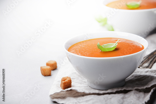 soup, tomatoes, dinner, lunch, food, basil, fresh, homemade, crouton, healthy, red, served, background, texture, rustic, concrete, spice, bowl, spoon, textile, vertical, closeup, dairy, seasonal, diet, orange, creamy, portion, epicure, fall, plate, hot, pepper, overhead, organic, vegetarian, vegetable, table, text, menu, copy space