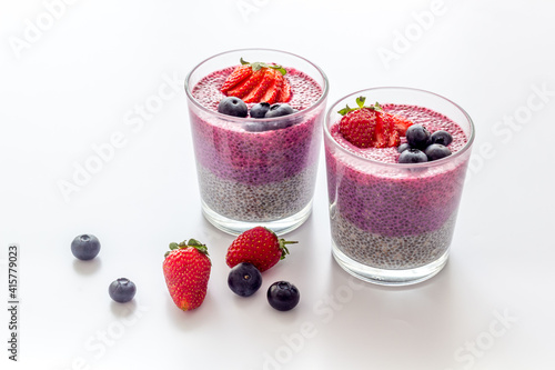 Homemade yogurt chia seeds pudding with strawberries in glasses