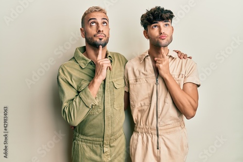Homosexual gay couple standing together wearing casual jumpsuit thinking concentrated about doubt with finger on chin and looking up wondering