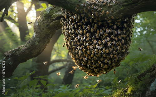 Honeycomb Swarm of Bees Hanging from a Tree Branch in Sunlight hive insects