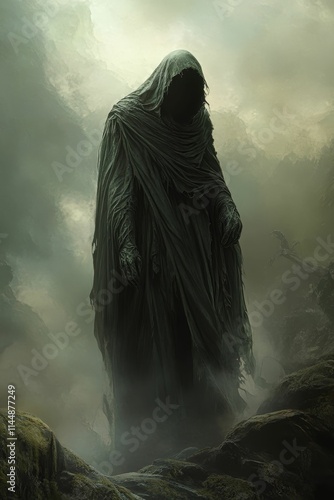 dark, figure, hooded, cloak, mysterious, ominous, shadowy, spectral, aethereal, haunting, desolate, landscape, mountain, fog, mist, rock, gloomy, sombre, foreboding, creepy, chilling, darkness, silence, solitude, lonely, grief, despair, fantasy, horror, supernatural