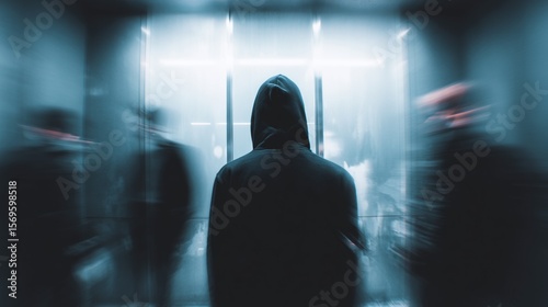 hoodie, elevator, urban, shadow, retro, grain, minimalist, blur, figure, contrast, light, modern
