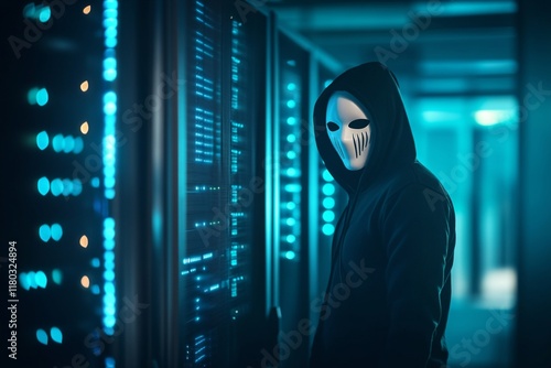 Hooded hacker in corporate data center. Rows of rack servers. AI training cluster. Cloud data storage. Cybercrime and network security. Digital information protection. Banner with copy space