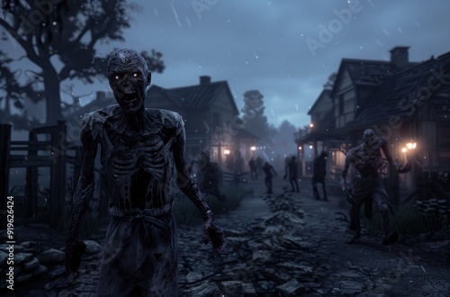 zombie, horde, village, road, night, dark, stormy, rain, skittish, scarey, horror, halloween, undead, monster, monster, apocalypse, death, decay, evil, creepy, walking, danger, fear, nightmare, three-dimensional, illustration, digital artwork, background, scene, concept, fantasy, gothic, grisly, eerie, abandoned, deserted, town, destruction, end of the world, survival, infected, blighted, virus, pandemic